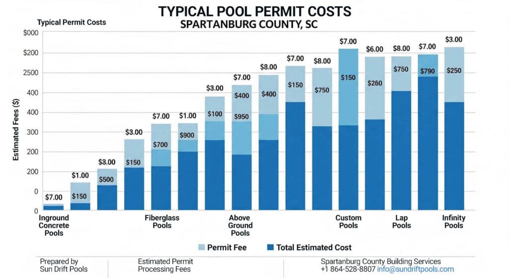 Pools with significant grading changes or retaining walls often require additional structural permits. Spartanburg County’s rolling topography means many pool projects involve substantial earthwork that triggers additional permit requirements.