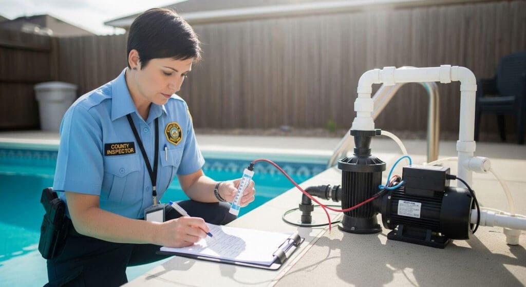 Electrical rough-in inspections occur before backfill and decking work begins. The inspector verifies proper conduit installation, grounding, and bonding before these systems are covered.